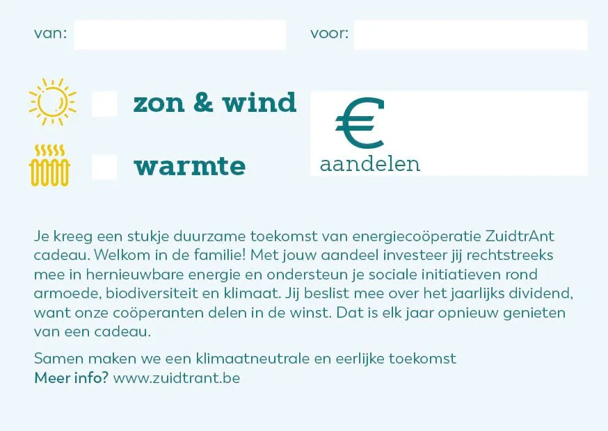 Je geeft een stukje toekomst, je geeft mede-eigenaarschap, je geeft hernieuwbare energie. En het mooiste van al: je geeft niet één keer een financieël duwtje, maar je geeft dat elk jaar opnieuw - via het jaarlijks dividend.
